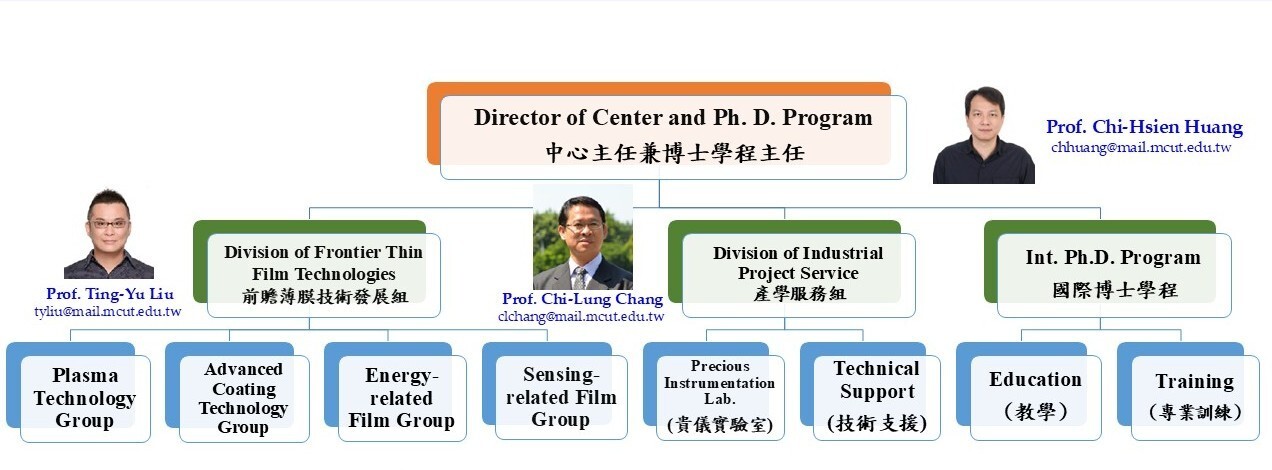 電漿薄膜發展組:HiPIMS技術小組、光電及半導體薄膜小組、生醫薄膜小組、電漿技術小組、能源薄膜小組。